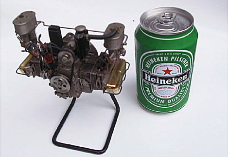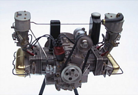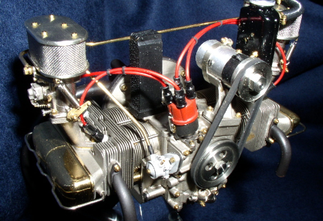 A jewel-like 1:8 scale model, individually hand-built by a European craftsman (Nolte) who made all parts himself from the appropriate metals, rubber, bolts and screws. Bolted assembly like the real engine, no glue. Fully movable internals: functional flywheel, fan, crankshaft, pistons, cams, and valvetrain. Other perfect details include accurate ignition wires, oil and fuel lines, Weber carburetors with working linkages, and a full exhaust system. Can be displayed with cam cover (or any other pieces) removed to show internal details.