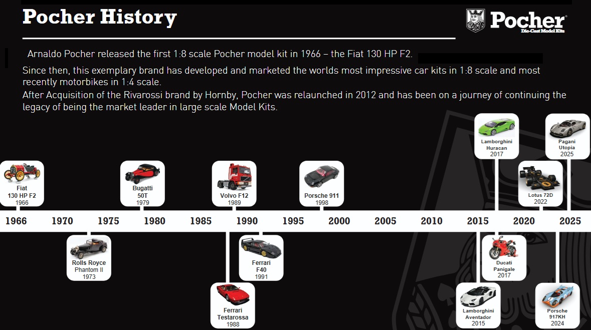 The original Pocher kits were produced sporadically for 30 years. Pocher's parent company Rivarossi was sold in 2000. After outlasting many US importers and parent companies, Pocher was liquidated in 2000 and the assets sold to Hornby International in the UK.